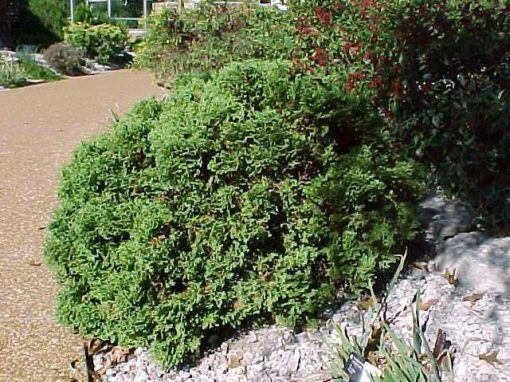 A small evergreen shrub with a dense, naturally globe-shaped growth habit. Rich green scale-like foliage is arranged in flat layered sprays. The compact form makes this a popular accent plant for mixed borders or containers. A very adaptable, tough, durable plant.