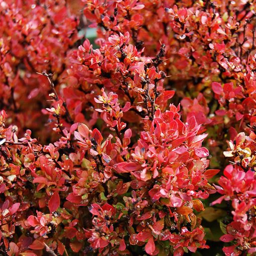 A striking, compact deciduous shrub prized for its dynamic and seasonally shifting foliage. In spring it begins with glowing yellow-orange leaves that mature into a deeper coral hue.Through summer and into autumn, the foliage gains ruby tones with gold-edged margins, creating a rich, variegated palette that draws the eye. Though its flowers are modest- pale yellow and inconspicuous- they add subtle spring interest before giving way to berries in some clients. Its compact size, attractive foliage, and deer resistance make it a favorite for gardeners who want bold color without a lot of fuss.