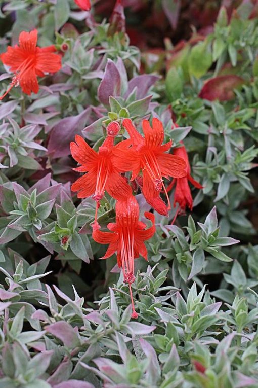 A mat-forming, low evergreen or semi-deciduous perennial. From its silvery foliage emerge bright red, tubular trumpet flowers in late summer through fall. Because of its groundcover habit and spreading rhizomes it can soften hardscape edges, cascade over slopes, or form a colorful carpet in sunny, well-drained areas.