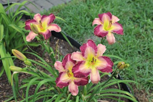 A dramatic and compact perennial that offers striking summer color without dominating the garden. Its soft pink blossoms are accentuated by bold burgundy eye zones and finely ruffled edges lined in burgundy, lending each bloom a dynamic, painterly quality. This cultivar forms tidy clumps, making it a great choice for front-of-border plantings, containers, or mixed beds where height needs to remain moderate.