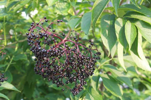 A robust and dual-purpose shrub that combines ornamental appeal with edible potential and ecological value. In late spring, the plant is festooned with broad, flat clusters of creamy white blossoms that perfume the air and draw bees and pollinators. As summer progresses, these blossoms transition to generous clusters of deep purple-black berries by late summer. Though the raw berries should not be eaten, when properly cooked they make superb syrups, jams, wines, and medicinal preparations.
