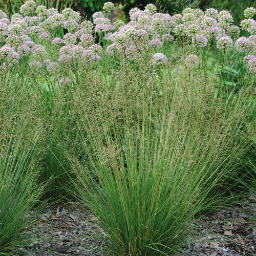 One of North America’s most graceful native grasses, prized for its fine, hair-like foliage that forms neat, arching mounds resembling green fountains in summer. In late summer, clouds of airy flower panicles rise above the clump, their soft pink-tan tones catching the light and swaying gently in the wind. The flowers have a subtle, sweet fragrance often compared to coriander or popcorn. By autumn, the foliage turns rich golden-orange, then fades to light tan through winter, providing long-lasting structure and movement in the landscape.
