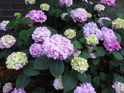 This reblooming mophead has rounded flowers averaging 3.5 – 5″ across in intense rose-pink, violet or blue, depending on pH levels.