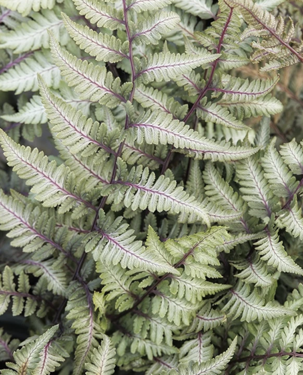 This dynamic painted fern of epic proportions has arching, silvery green fronds with deep purple midribs that radiate outward from a supersized spreading clump. The massive form and dramatic foliage is sure to thrill in a shaded bed or woodland setting, partnered with larger hostas.