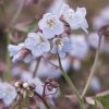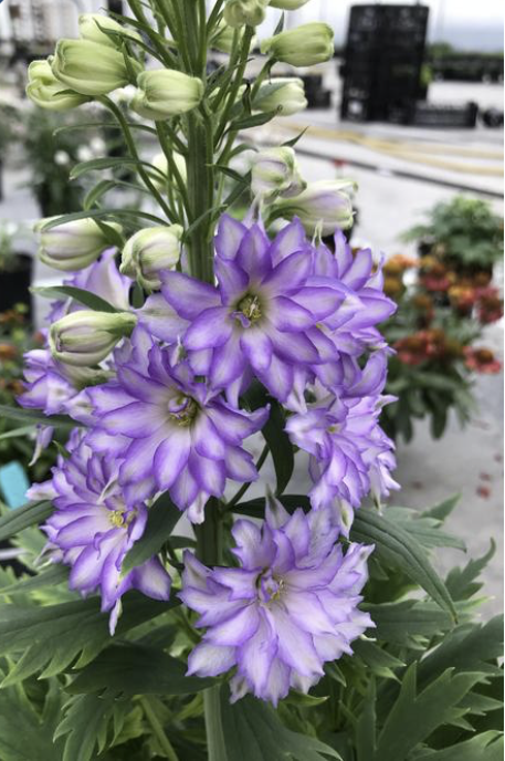 Deer-resistant and pollinator-friendly, this plant features sturdy, multi-branching stems that support tall spires of large, semi-double lavender-purple flowers. Each stem can produce 20-30 flowers, with more than 500 blooms per plant over the growing season. The flowers have highly ruffled petals, a white center, and a green bee, creating a spectacular display that attracts pollinators and makes excellent cut flowers.