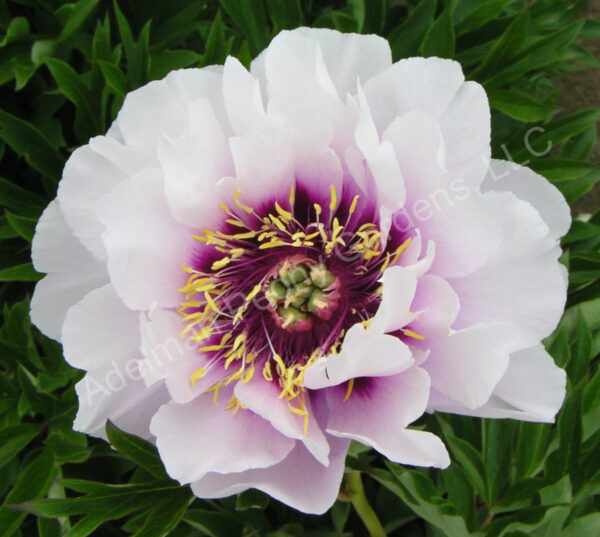 Large, semi-double, lightly fragrant blossoms, white with striking dark lavender central flares, stand above lush, toothed foliage.