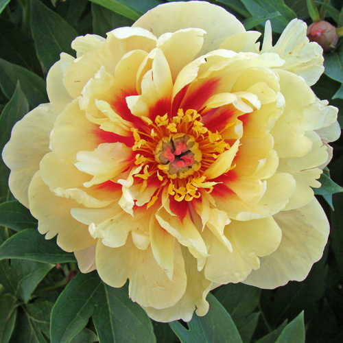 A beautiful intersectional peony cultivar that provides an arresting blend of warm tones and structural elegance. In spring, its flowers open with lively orange hues before softening into a gentle peach-yellow as they mature. Each bloom features bold, dark red flares at the center, adding visual drama and depth. The plant forms a compact mound of glossy, dark green foliage.