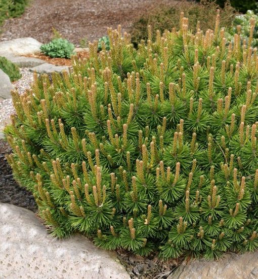 A refined dwarf mugo pine prized for its ultra-compact, rounded form and dependable performance. Over many years, it develops into a low mound of dense, dark green needles that provide year-round structure without becoming overbearing. Ideal in tight spaces, rock gardens, or container landscapes where a full-sized pine would be out of place. The foliage’s fine texture and rich tone make it a striking evergreen contrast to softer plants, and because it holds its shape naturally, it rarely needs pruning.