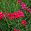An evergreen perennial known for pale blush-pink petals with vibrant coral centers and serrated edges, creating a watercolor effect. Borne on sturdy stems atop a cushion of blue-green foliage. Developed for its spicy fragrance and long bloom season.