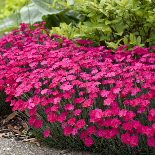 An evergreen perennial that forms a dense, mounding habit. It produces large, fragrant, frilly magenta flowers from late spring to late summer. The plant’s narrow, blue-green foliage provides an attractive backdrop to the vibrant blooms.