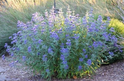 A handsome, late-summer blooming shrub. In late summer through early fall, it produces abundant spikes of deep blue/ bluish-purple flowers that rise above its silver-toned foliage, creating a dramatic contrast in the garden. Its leaves are gray-green with a soft, silvery underside and emit a pleasant fragrance when brushed or crushed, adding sensory interest beyond its blooms.