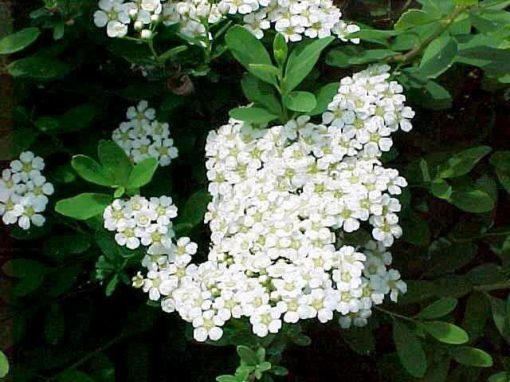 Profuse white flowers in small corymbs cover the arching stems of this plant in late spring.