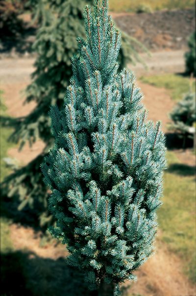A striking, columnar form of Colorado Blue Spruce that brings height and color in a tight footprint. It develops a narrow, upward-growing form reaching perhaps 12 to 15 feet tall while maintaining a width of just about 3 feet, making it perfect for narrow spaces, vertical accents, or framing entries. The needles glow in a vivid steel-blue that adds visual drama and contrast, especially in formal or architectural settings.